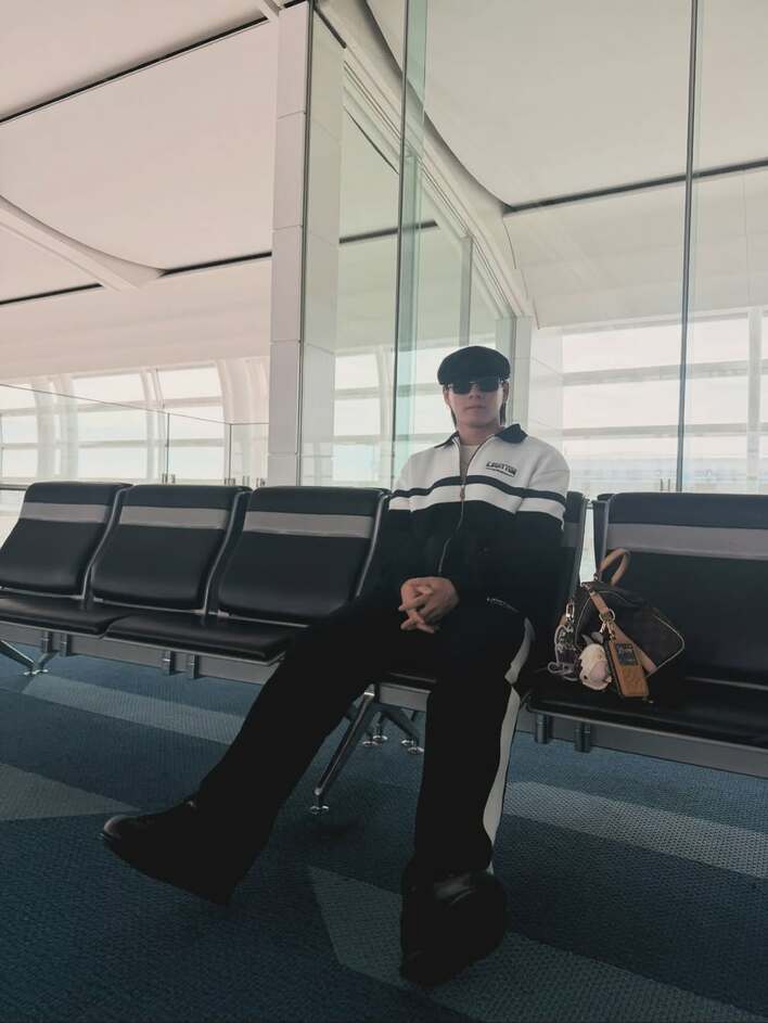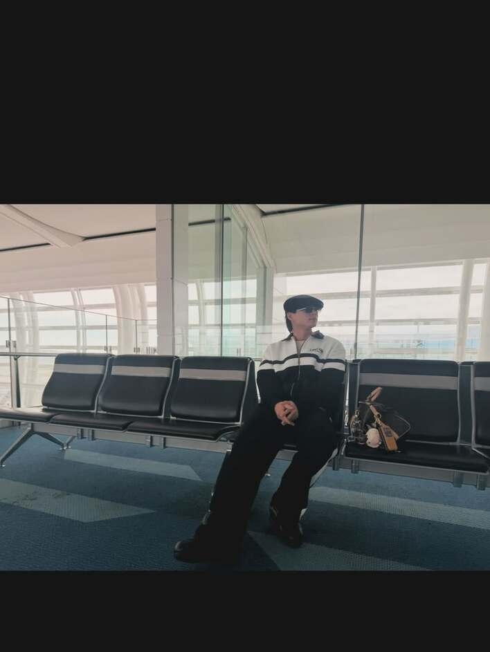 そこには、ハンチング帽にサングラスをかけ、空港のベンチに腰掛ける平野さんの姿が。