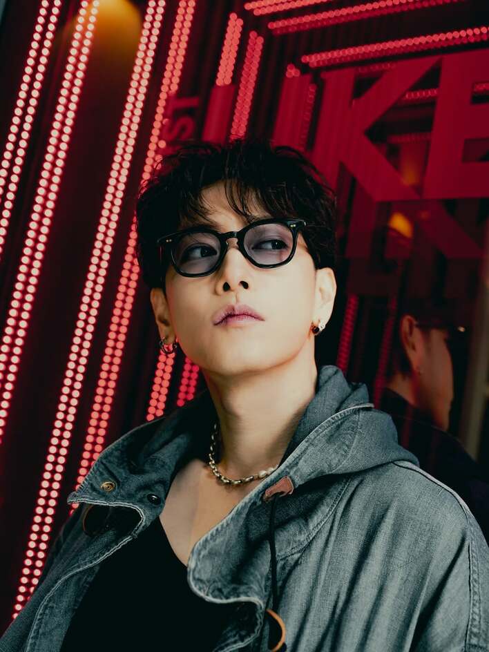 赤いネオンライトをバックに撮影されたショットでは、サングラスをかけてカメラから視線を外すクールな表情を披露!