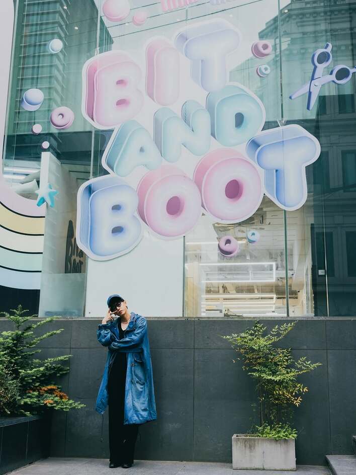 韓国の有名ヘアメイクサロン「Bit&Boot」の前で撮影されたショットでは、水色のキャップに同じく水色のロングアウターを羽織った佐藤さんが少しだけ首をかしげながら顔の横で裏ピース。