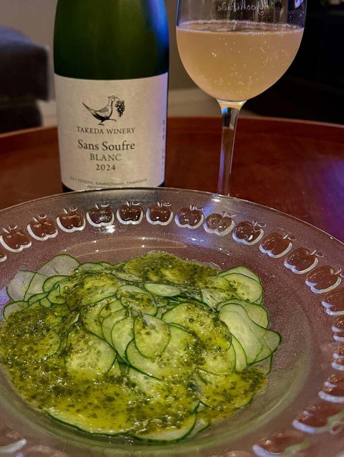 薄くスライスされたきゅうりに、「バジルソースとレモン汁にほんの少しワインビネガーをプラスして、塩で味を整えたドレッシングでいただきます」と説明。奥にはスパークリングワインが置かれていて、「ワインとの相性も最高で、とても美味しかったです」と満足した様子でした。