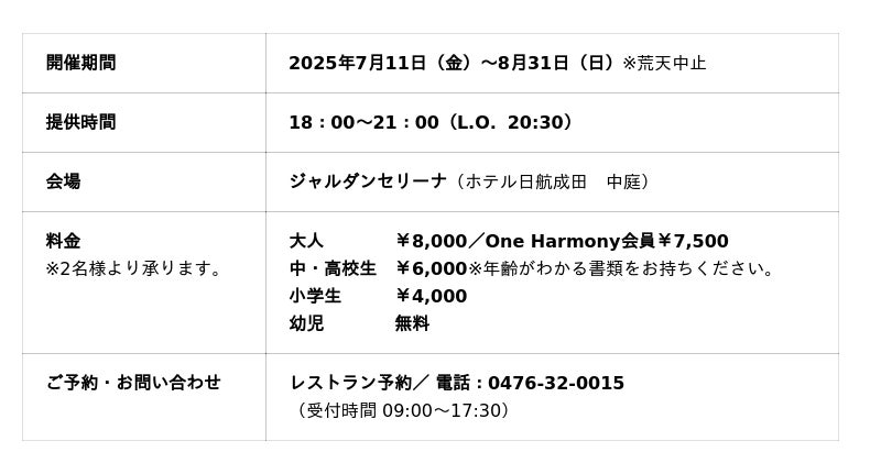 ホテル日航成田(所在地:千葉県成田市、総支配人 山田 篤)では、ホテル中庭にて『The GARDEN BBQ 2025』を2025年7月11日(金)~8月31日(日)の期間に開催します。千葉ブランド水産物認定の「九十九里地はまぐり」をはじめ、肉・魚介・デザートまで多彩なメニューを食べ放題でお楽しみいただけるほか、本年は新たに中学生・高校生料金を設け、ご家族皆様でご利用しやすい料金設定としました。