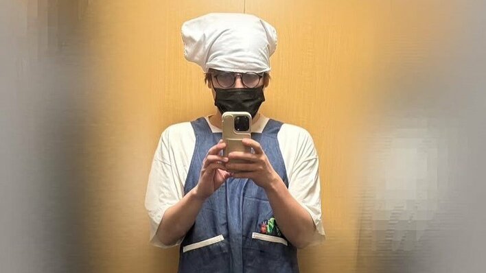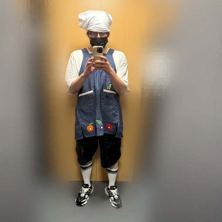 そこには、白いTシャツにブルーのエプロン、黒い膝丈パンツにスポーティな靴下を履き、頭には白い三角巾という謎の出で立ちでスマホカメラを握るりんたろー。さんの姿が。