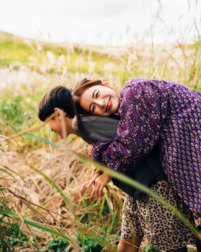 一面すすきの景色の中で、スザンヌさんが息子をバックハグし、背中にもたれかかったショットや…