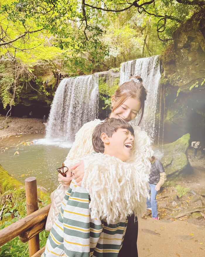 鍋ヶ滝を背景に、息子を抱き寄せて、いとおしそうな表情で見つめるスザンヌさん。