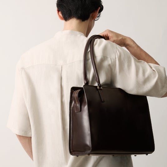天然の牛革にオイルを丁寧に浸透させ、一点一点異なるつやと濃淡を持つアンティークレザー。このレザーで仕立てられた「Antique Flyarch Tote(アンティーク フライアーチ トート)」は、ミニマルなデザインでありながらも、使うほどに色つやが深まり、風合いが変化します。そうして生まれる自分だけの表情が、持つ人の個性をナチュラルに引き出します。