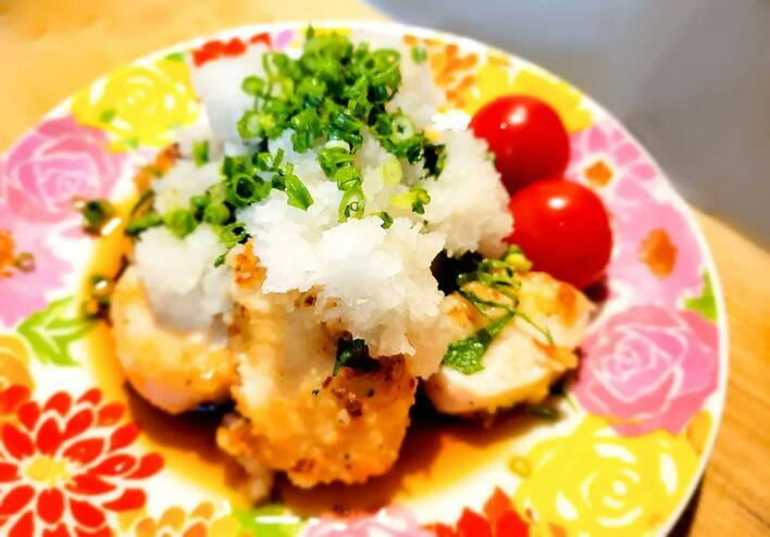 鶏むね肉、マヨネーズ、片栗粉、油、ポン酢、大根おろし、万能ねぎ、プチトマト