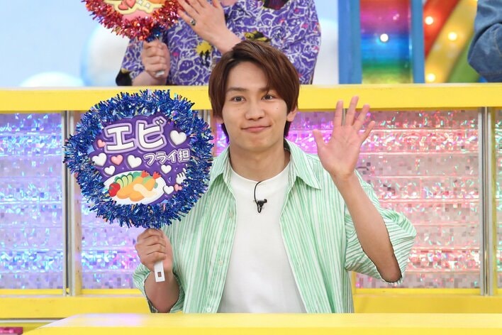 藤原さんは“エビフライ推し”だそうで、なにわ男子での自身のメンバーカラーである青いうちわを持ちながら、「エビフライ出てきてテンション下がる人いない!」と熱弁します。