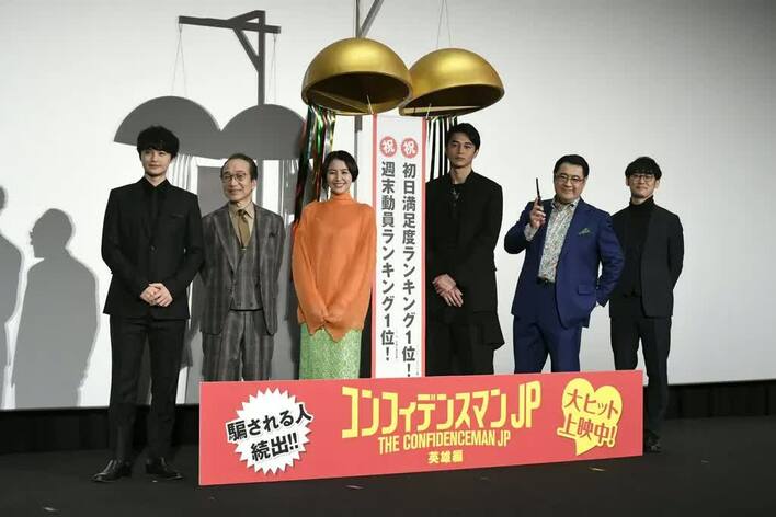 映画「コンフィデンスマンJP 英雄編」の大ヒット御礼舞台挨拶が1月23日に行われ、長澤まさみ、東出昌大、小手伸也、小日向文世、瀬戸康史、田中亮監督が登壇した。