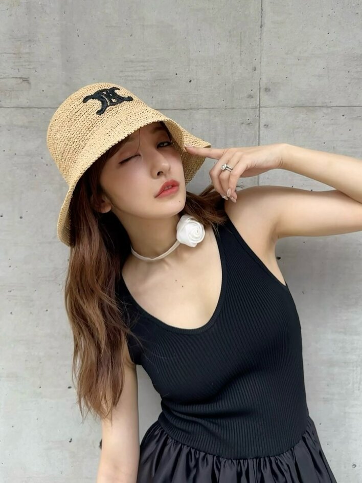 まずは黒のロングワンピースに麦わらの帽子をかぶった板野さん。