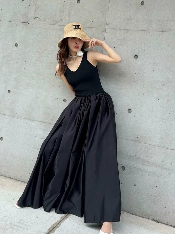 上はリブニット素材のタンクトップでヘルシーに肌見せし、下はギャザーが入ったボリューム感たっぷりのサテンのスカートのスタイルとなっています。