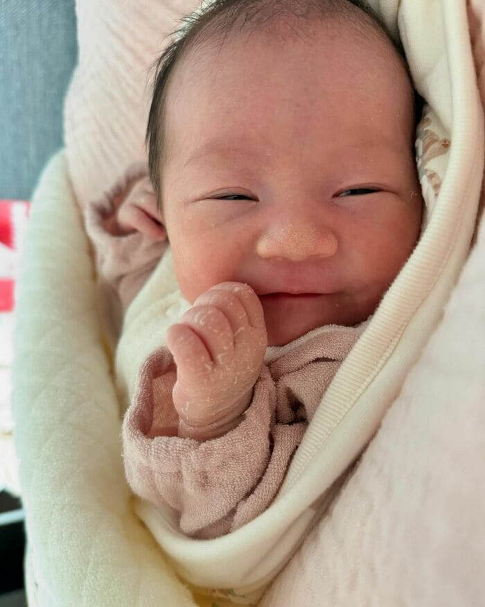 この投稿にSNSでは「ぴったりな表情してますね」「お二人の子供だから笑顔が多そう」「お名前もお顔も可愛いすぎ」などの声が寄せられています。