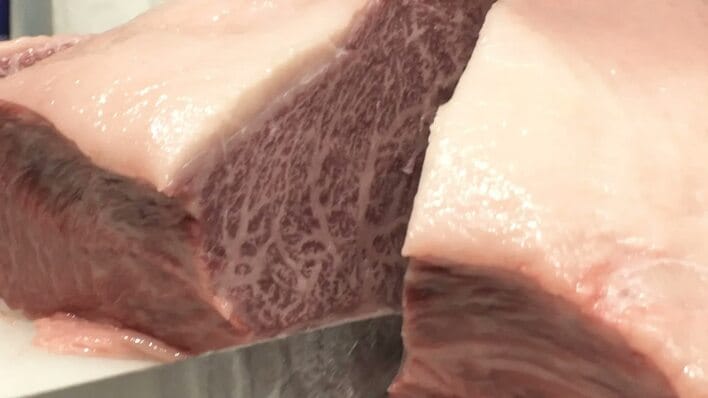 産地や部位など、目利きにはさまざまな要素があるというが、何より重視するのが「自分が食べたいかどうか」。高価なため普段はあまり仕入れないというサーロインも、「脂と赤身のバランスがここまで美しいものはなかなか無いので惹かれた」と仕入れを決めた。