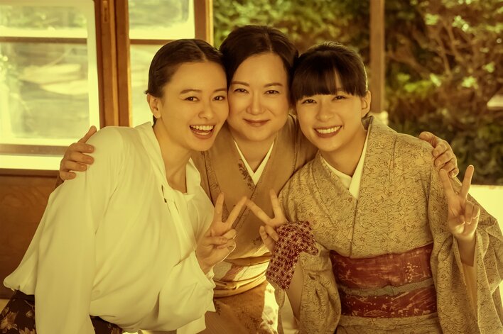 芳根さん、山本さん、和久井さんは、3人で頬を寄せ合いニッコリ。芳根さんはダブルピース、山本さんは片手でピース、和久井さんは2人を抱き寄せており、温かい空気の伝わる1枚です。
