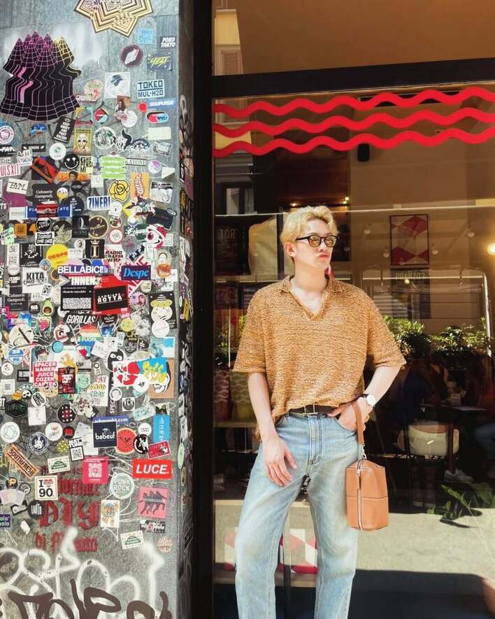 また、キャメル色のトップスにライトブルーのデニム、そしてカラーレンズのサングラスをかけ、口をすぼめた表情で、大小さまざまな大きさのカラフルなステッカーで覆われた壁の隣に立った姿も公開。