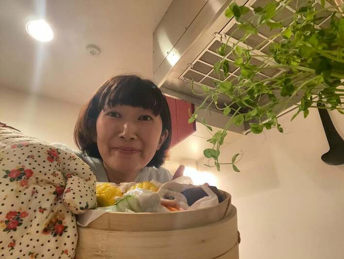野菜などが山盛りに入ったせいろをカメラに見せる川村さん。