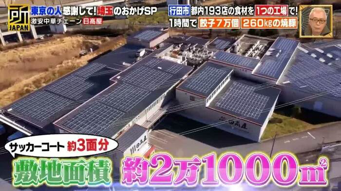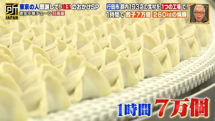 埼玉の工場で、徹底的に人件費がカットされ、東京都民に激安中華を届けている。この工場では、ほかにも機械を駆使し、カット野菜、中華麺、焼豚の製造も少人数で行われている。
