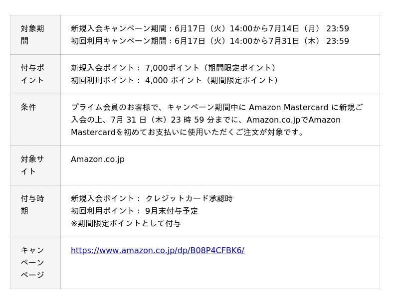 キャンペーン期間中にプライム会員のお客様が Amazon Mastercard に新規入会し、初めて利用いただくと、新規入会で7,000ポイント(期間限定ポイント)を、初回利用分として4,000ポイント(期間限定ポイント)をプレゼントします。 Amazon Mastercardは入会費と年会費ともに永年無料です。