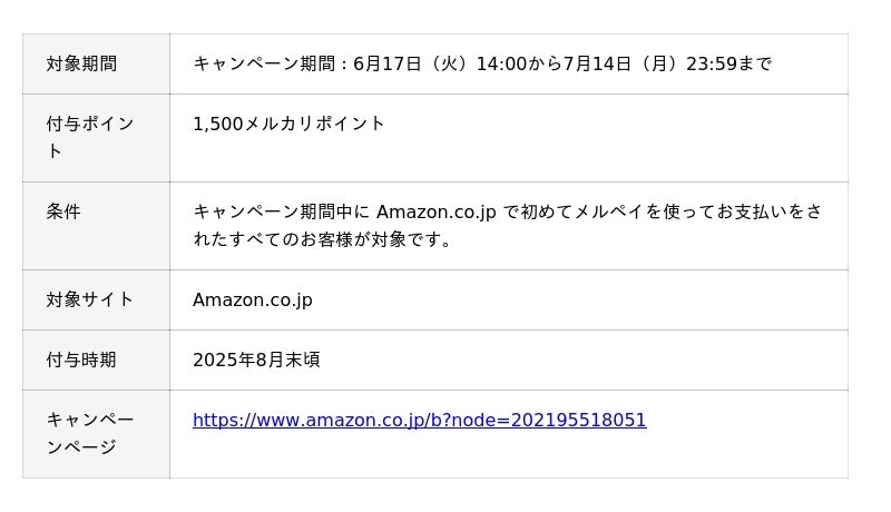 Amazon.co.jpで初めてメルペイを利用してお買い物されたすべてのお客様に、最大5%のポイント(最大1,500メルカリポイント)が還元されます。