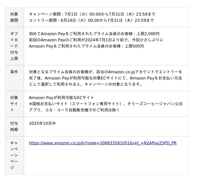 対象のECサイトでAmazon Payを初めて利用いただいたプライム会員のお客様には、ご利用金額の20%分のAmazonギフトカード(上限2,000円)を還元します。また、ひさしぶりに利用いただいたプライム会員のお客様には、ご利用金額の5%分のAmazonギフトカード(上限500円)を還元します。