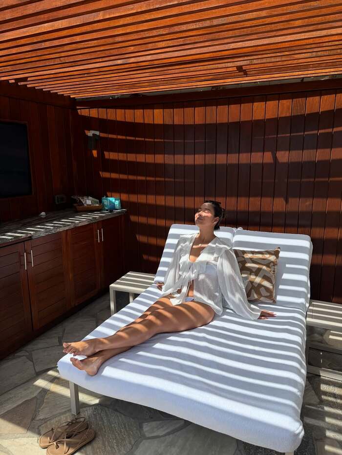 「2つのインフィニティープールで遊んだあとは、家具もリニューアルしたプライベートカバナでゆっくりして、息子も大喜びで楽しい思い出ができました」と家族での楽しい時間を満喫した様子のすみれさん。
