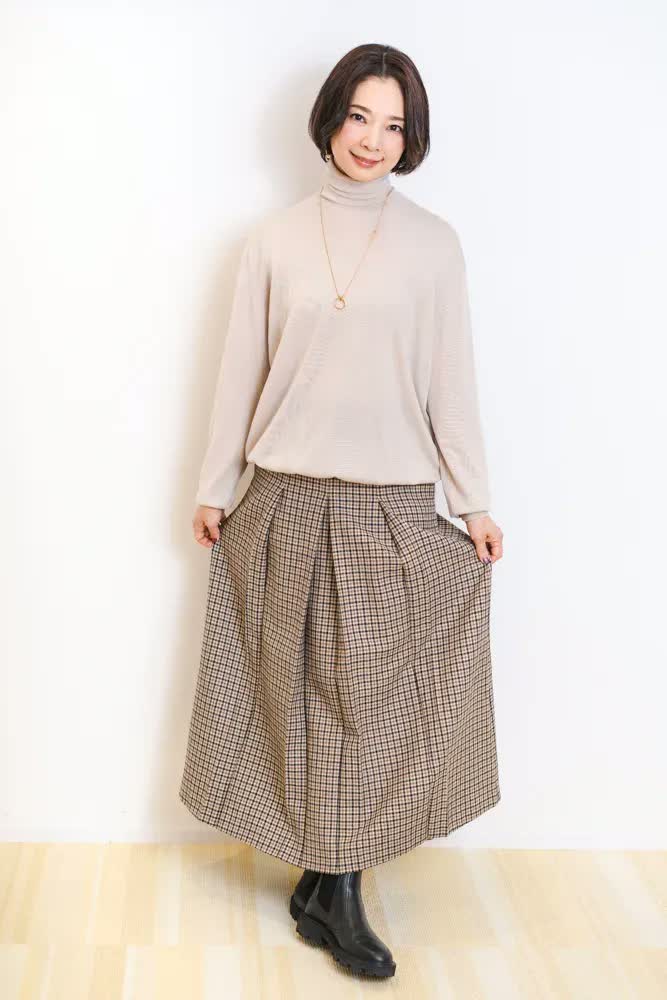 ポイントはスカートです。冬は全身“まっくろくろすけ”になりがちなので、ちょっとデザイン性が強いものを選びました。「Drawer」というブランドです。もともと、こちらのお洋服が大好きなのですが、これはセールに駆け込んで買いました(笑)。