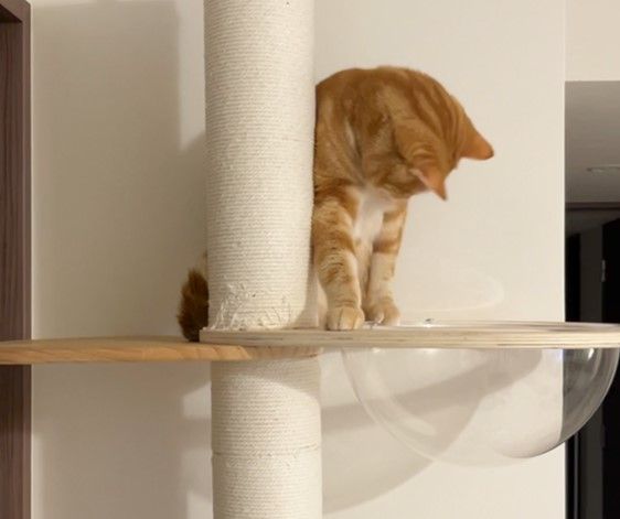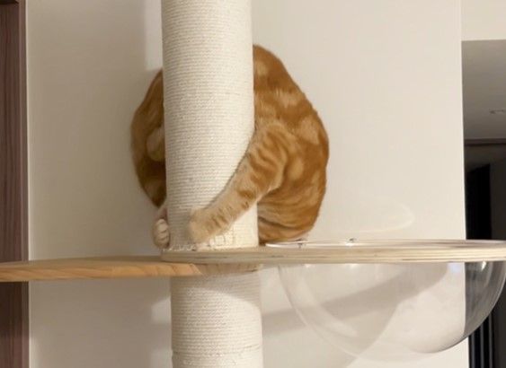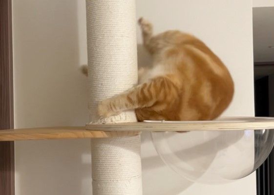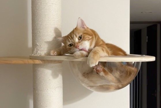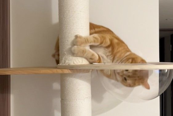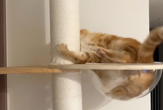 動画には、キャットタワーの上で座っている「ロイ」くんが、丸い透明なベッドを見つめている様子が。すると、次の瞬間…