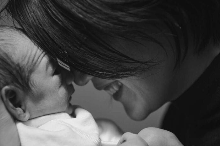 栗原恵 生まれたばかりの我が子とモノクロ家族ショット