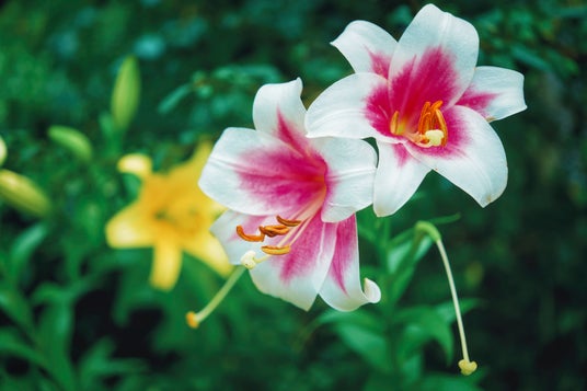 黄色、ピンク色の2種類のユリ(オリエンタルリリー)が一面に咲き誇ります