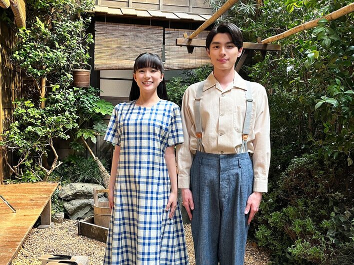 芳根さんは青いチェック柄の涼しげなワンピース、本田さんはクリーム色のシャツとグレーのパンツにサスペンダーを合わせた、夏らしい装いです。