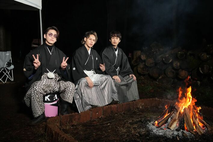 3人で真冬に袴姿でバーベキュー