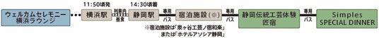 横浜駅を出発し、いよいよ東海道・富士クルーズの旅が始まります。昼食はフレンチの名店「エルマイヨン」。静岡の食材を使い、どこか優しい本格フレンチをお楽しみいただけます。車窓には相模湾、駿河湾そして日本が誇る美しい富士山。碧く煌めく車窓に思わず刻を忘れることでしょう。静岡に到着後は今川・徳川時代から受け継がれた静岡の伝統工芸の体験をお楽しみいただきます。夕食は静岡の名店Simples。静岡・焼津の「サスエ前田魚店」から仕入れた魚や静岡の生産者から受け取った食材を最大限に活かした静岡でしか味わえない料理をお楽しみください。