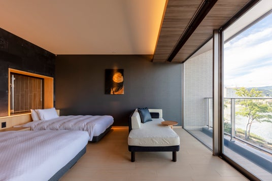 灯屋 迎帆楼国宝犬山城を背に雄大な木曽川を臨む客室は、全室温泉を楽しめる半露天風呂付。木曽川や犬山城から吹き抜ける風を感じながら解放感あふれる寛ぎの時間をお過ごしください。