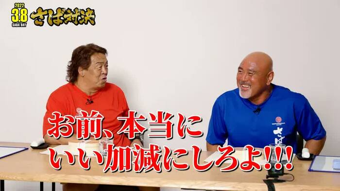 「さばが大好き!」とやる気満々の武藤と、昨年勝者の余裕なのかリラックスした様子の長州という、対極的な登場シーンから対決はスタート。ナレーション対決では、先攻の武藤から「難しい。これじゃ長州さんは100回やってもできない」と言われた長州。果たして、無事に噛まずにナレーションができるのか…。