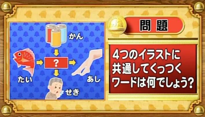 最初は、「脳ミングアップクイズ」から、くっつきワード問題。次の4つのイラストに共通してくっつく言葉は何でしょうか?