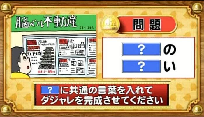 最初は「脳ミングアップクイズ」から、ダジャレ穴埋め問題。「?」に共通する言葉を入れてダジャレを完成させてください。