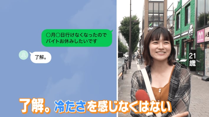東京都内で10代~25歳の100人に聞いたところ、69%もの人が「了解。」について冷たく感じると回答していました。