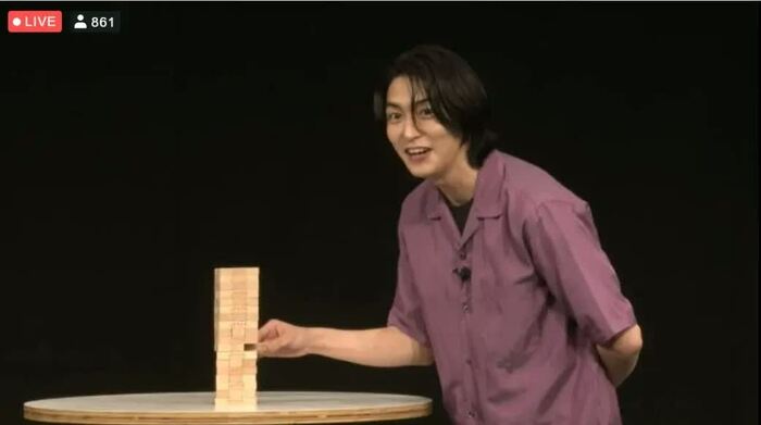 しかし、2週目で宮沢が「友くん、動かないよ…」と言いつつ勢いよくブロックを引き抜いて倒してしまい、対決終了。まさかの激短対決になったためか、宮沢は「ここからやりません?」と倒れた際に残った6段ほどのジェンガでの対決を申し込み。上目遣いでのおねだりに、稲葉は「なんだよそれ!…やる?」と後輩に激甘な一面を垣間見せた。