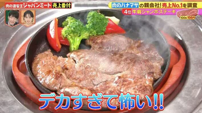 「肉のハナマサ」の親会社でもあるスーパー「ジャパンミート」の売上番付は、業務スーパーの達人・業務田スー子と藤本美貴、神田愛花が調査した。