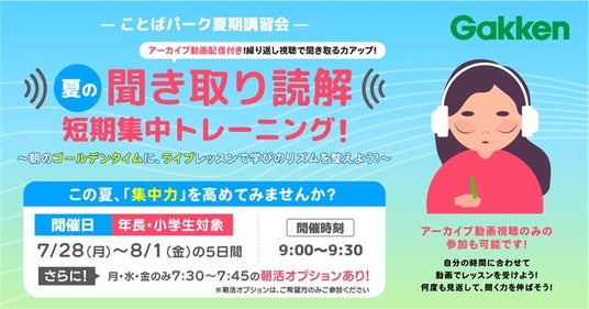 株式会社 学研ホールディングス(東京・品川/代表取締役社長:宮原博昭)のグループ会社、株式会社学研エデュケーショナル(東京・品川/代表取締役社長:川端篤)は、国語に特化したオンライン学習プログラム「ことばパーク」において、7月28日(月)~8月1日(金)の5日間限定で、「ことばパーク夏期講習会~夏の聞き取り読解短期集中トレーニング!」~を開催いたします。
