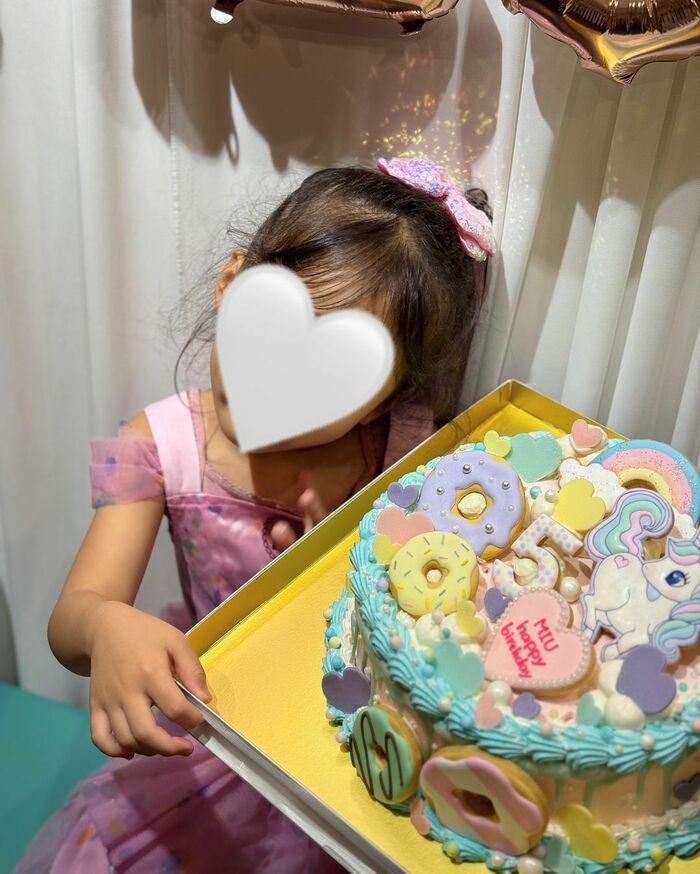 顔よりもはるかに大きく、パープルやイエロー、ブルーなどのパステルカラーでデコレーションされた"ゆめかわいい"ユニコーンのケーキを手に、首をかしげてポーズをとっている次女。ケーキの真ん中には数字の「5」が飾られています。
