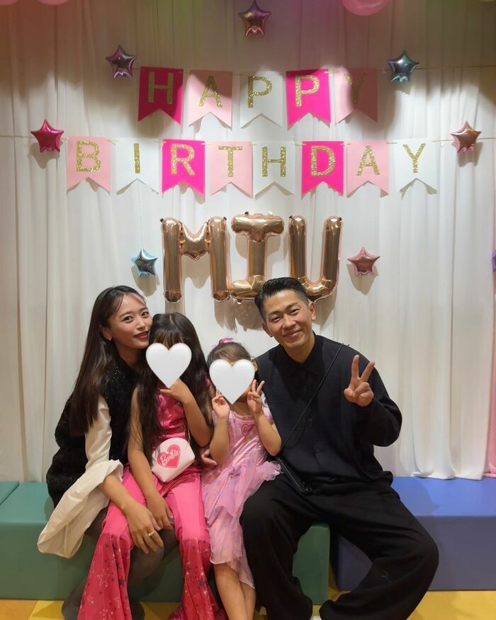「HAPPY BIRTHDAY MIU」の装飾を背に、太田さんと近藤さんが姉妹2人を真ん中に囲んだ家族4人のショットも披露!