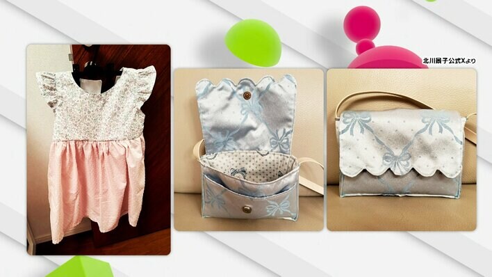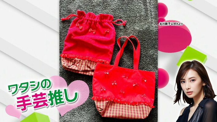 スタジオでは北川さんが実際に作ったというリボンがあしらわれた赤色の手提げバックや巾着などが公開。
