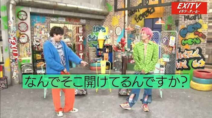 まずは番組恒例となったEXITのオープニングトーク。「さあ、始まりました」と登場した兼近さんの衣装を見たりんたろー。さんはすかさず、「なんでそこ開けてるんですか?」と脛の部分だけがザックリ開いた衣装にツッコミを。