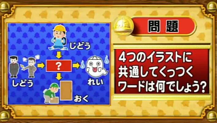 最初は「脳ミングアップクイズ」から、くっつきワードの問題。次の4つのイラストに共通してくっつくワードは?