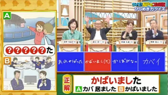 正解は「かばいました(カバ 居ました/かばいました)」。直江さん1人が見事正解。