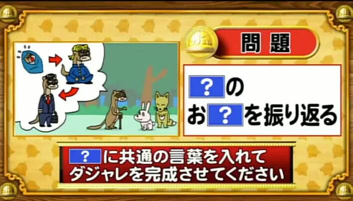 最初は「脳ミングアップクイズ」から、ダジャレ穴埋めの問題。「?」に共通する言葉を入れてダジャレを完成させてください。