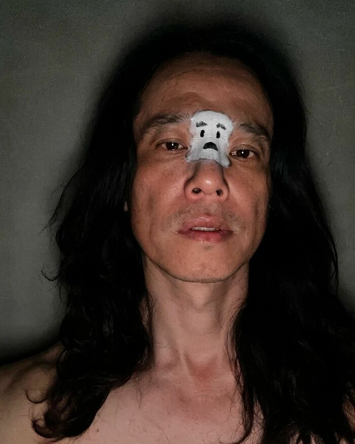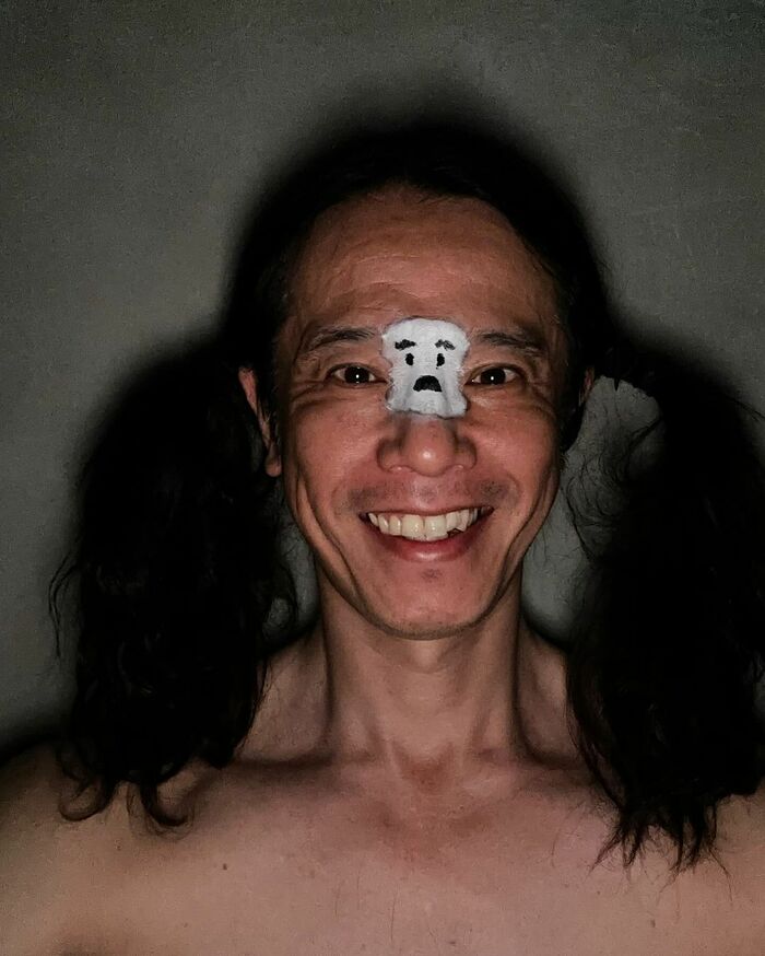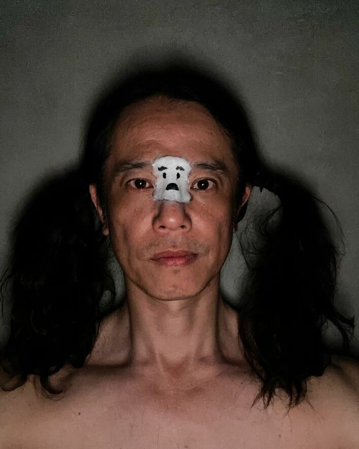 真っ暗な部屋の中で、長髪を二つ結びにしている庄司さん。ライトの当たり方も相まって少しホラーな雰囲気が漂いますが、よく見ると眉毛の間に何やら顔らしきものが…