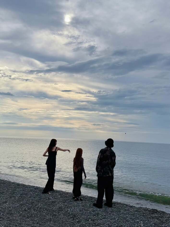 鈴木さんは長い腕を大きく前に振り、海に向かって小さな石を投げているようですが、全身モノトーンの服に身を包んだ2人の後ろ姿はよく似ています。