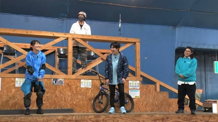 すると、段ボール前のバンクで勢いよくツッコんでこけ、全員が爆笑。小峠さんから「ジャンプ台と間違えてるんじゃないかと。飛び越える勢い。ジャンプ台じゃないからね」と言われつつも、勇気あるパフォーマンスに「よかったよ」と称賛が。