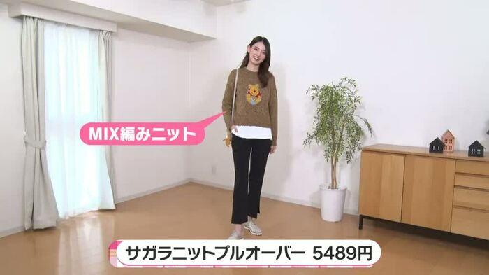他にも、真ん中にインパクト抜群なプーさんのワッペンが描かれたミックス編みニットにも注目です。ショート丈なのでインナーに白のロングTシャツを入れてレイヤードすると大人っぽい印象になりますよ!